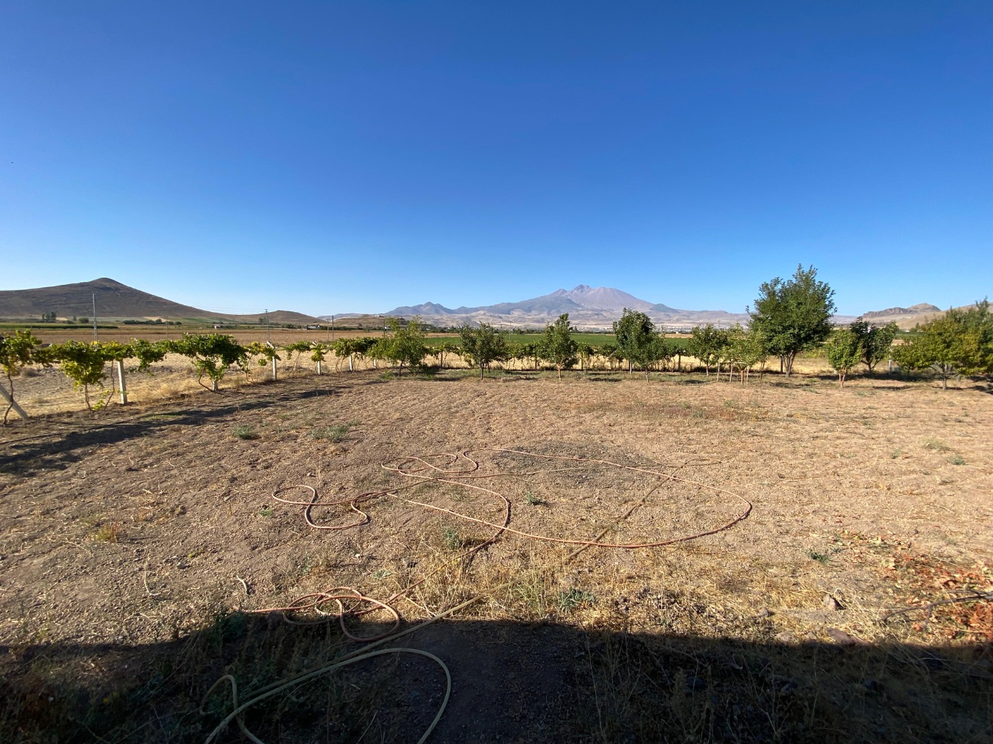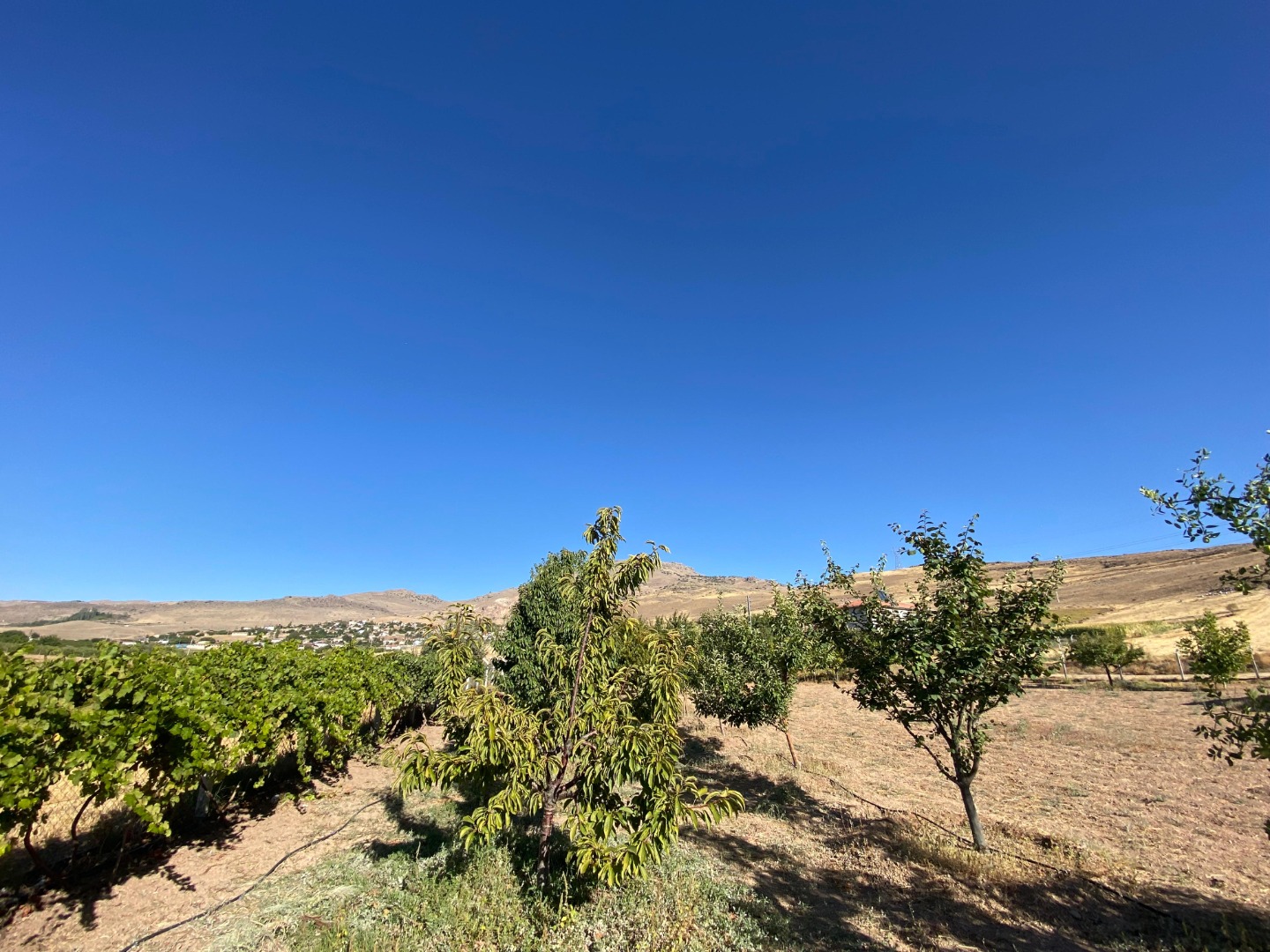 BAHÇESİNDE ÜZÜM ASMALARI VE ÇEŞİTLİ MEYVE AĞAÇLARI VARDIR;